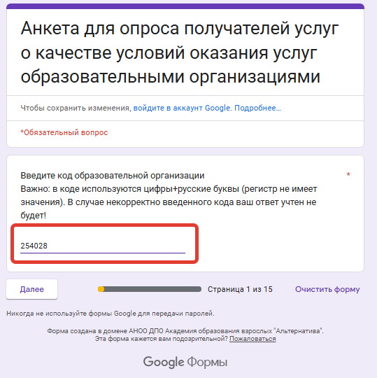 Код МБОУ ДО "ДЮСШ" (его надо вписать как на фото): 254028